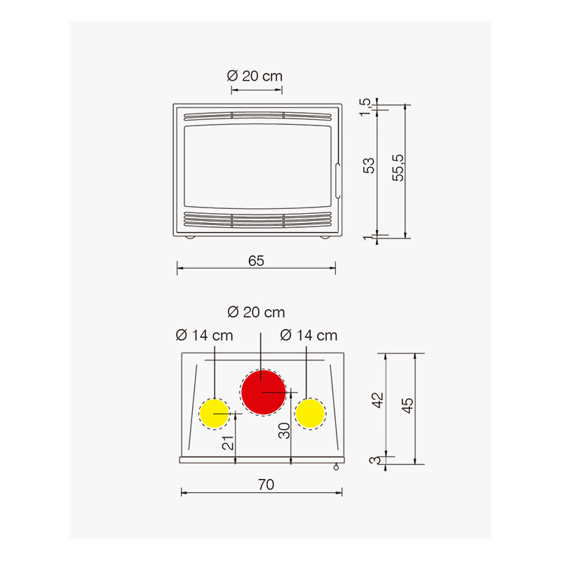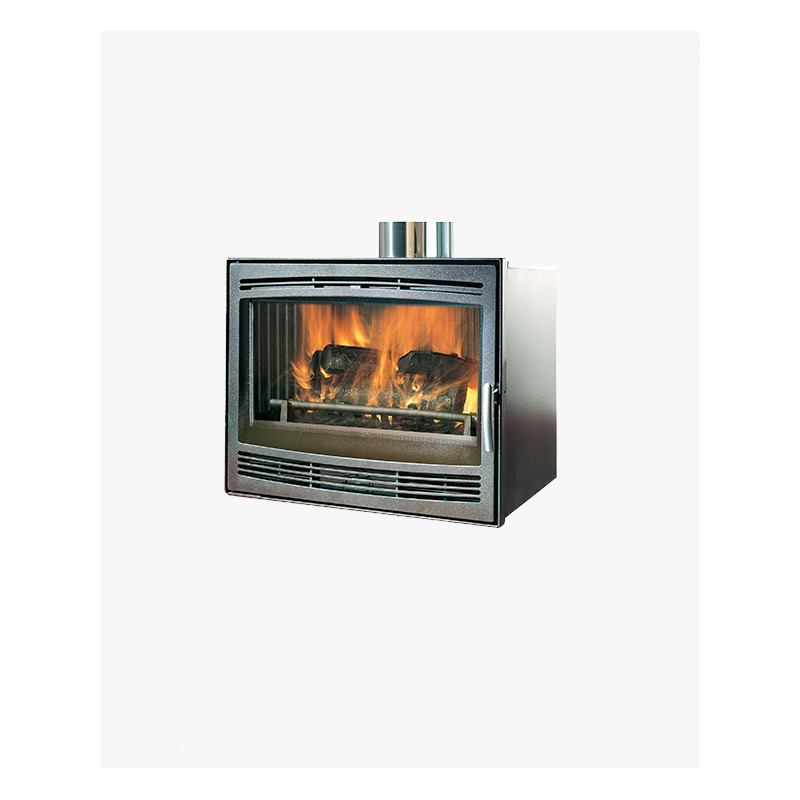 Totalmente construido con placas de fundición de gran espesor y acabado en pintura anticalórica resistente hasta 650ºC. El hogar de fundición está recubierto por una cámara exterior de recuperación de acero reforzado.